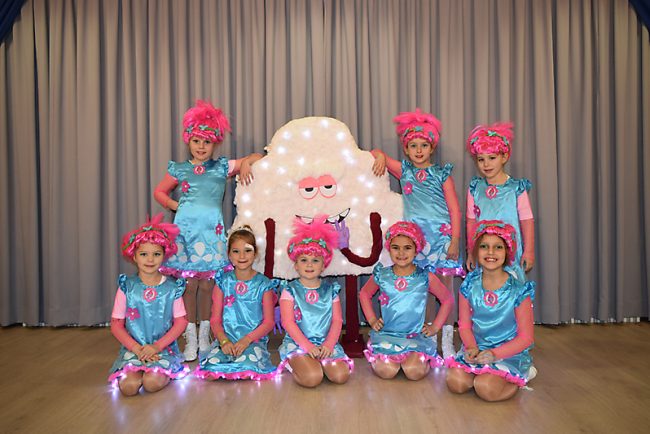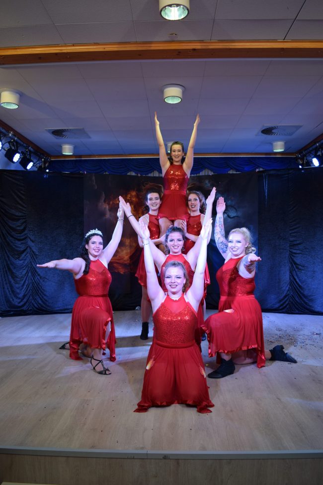 Das Bild zeigt junge Frauen in silberen Minikleid bei der Schlußfigur des Showtanzes