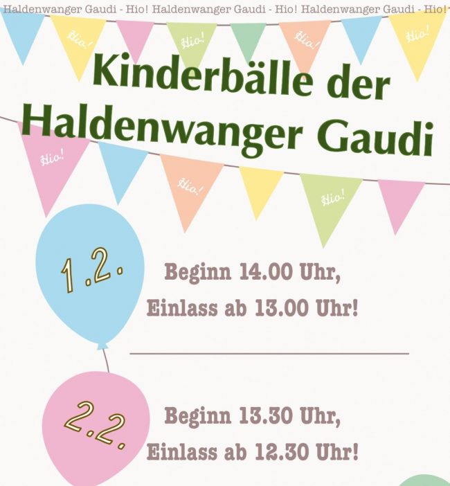 Es ist wieder Kinderball in Haldenwang. Das bedeutet, die Haldenwanger Gaudi zeigt ihr komplettes Kinderprogramm zum verbilligten Eintrittspreis von 5 Euro. Als Gäste erwarten wir: den LCV aus Waldstetten 30 Minuten Rock*n*Roll: seid gespannt Der Vorverkauf für beide Bälle ist am 27.1. von 17:00 bis 19:00 Uhr im Gaudi-Pub. Eine telefonische Reservierung ist nicht möglich.